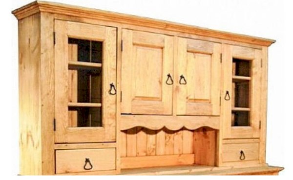 Комплект из нижней тумбы и верхнего буфета выполнен в стиле Прованс. В нижней части отлично разместятся соленья-варенья, посуда и скатерти. За стеклянными дверцами можно хранить праздничные сервизы, семейные раритеты, интерьерные вещицы.  Задние стенки всех буфетов набраны из дощечек массива сосны. Также из массива сосны набраны днища ящиков. В конструкции нет элементов из фанеры, ДСП, или МДФ.