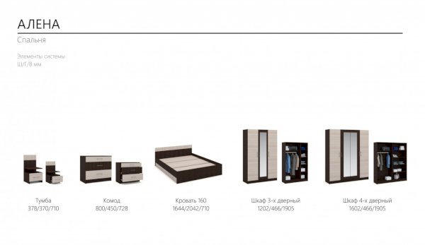Модульная спальня Алена Венге/Дуб молочный (Империал) - за 34 760 руб. в Новороссийске. Купите на сайте novorossiysk.onlinemarketmebeli.ru или по телефону 8(800)505-30-63 уже сегодня! Уточнить наличие, комплектацию, актуальную цену можно бесплатно у менеджера ежедневно. Закажите Модульная спальня Алена Венге/Дуб молочный (Империал) до конца акции! Доступна покупка в кредит, рассрочку. Доставим со склада или на заказ.