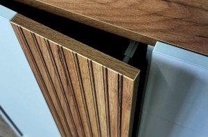 С другой стороны комод оборудован выкатным ящиком, который обеспечивает легкий доступ к часто используемым предметам. Под ним расположен большой глухой фасад, скрывающий за собой просторное хранилище для более крупных вещей.