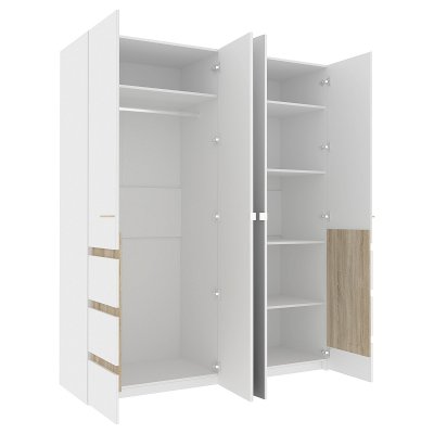 Глубокий распашной четырехдверный шкаф для одежды и белья с зеркалами с чёткой организацией внутреннего пространства обеспечивает комфортное хранение вещей всей семьи. Конструктивом Шкафа предусмотрены: отделение для хранения белья с регулируемыми по высоте полками и отделение для одежды со стационарной штангой. Дверки Шкафа АНОНА 8 с доводчиками для плавного и бесшумного закрывания. Их украшают аккуратные вставки в декоре Дуб Сонома и зеркала во весь рост с фацетом.