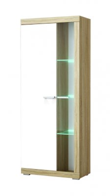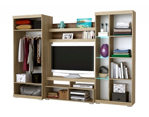 В гостиной Соната применяются современные европейские декоры: корпус выполнен из ЛДСП Дуб сонома, фасад из ЛДСП Белый глянец. Декоры отличаются выраженной тёплой древесной текстурой, а фасадная часть подчёркнута горизонтальными линиями текстуры и стильными планками МДФ, представляющими собой элементы корпуса и фасада.