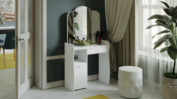 Помимо внешней привлекательности стол оснащен большим зеркалом с поворотными зеркальными створками, вместительную столешницу под которой располагается выдвижной ящик, открытая ниша для хранения и секция с дверцей, где можно разместить все необходимые аксессуары и косметику. Удобные отсеки помогут поддерживать порядок и удобство в Вашем уголке красоты.