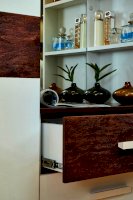Деревянные брашированные вставки в декоре Орех Шоколадный покрыты лаком, который подчеркивает рельефную структуру поверхности.