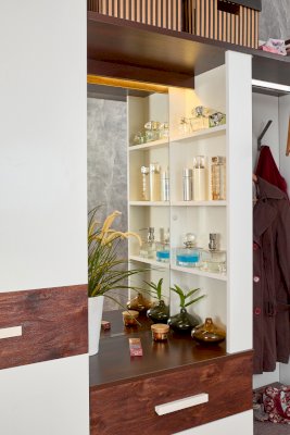 Шкаф МЦН 70 Норвуд включает множество элементов: крючки, стационарная штанга, открытые полки, выдвижные ящики, отделение за откидным фасадом, открытая ниша, зеркало с подсветкой. Встроенная светодиодная подсветка включается при помощи аккуратного кнопочного выключателя.