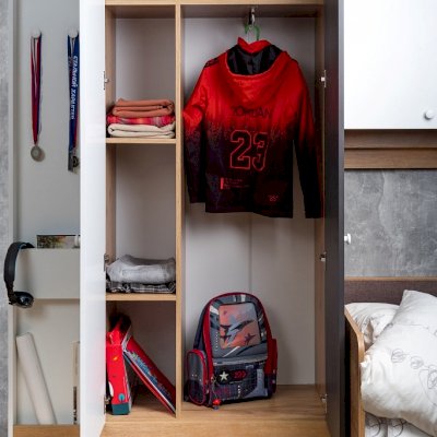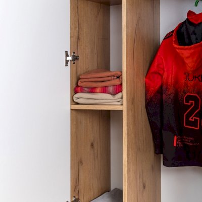Наполнение 92 Шкафа для одежды и белья продумано до мелочей: выдвижные ящики, стеллаж для одежды и выдвижная штанга для плечиков – всё это помещается в одном модуле. Три варианта фасадов позволяет выбирать цветовое решение для дверок шкафа: заказывать их в контрастном исполнении или в монохромном. Для выбора доступны фасады Белый и Графит. Для надежности рекомендуем крепить шкаф к стене на подвесы.