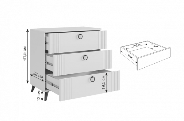 Комод "Ева" идеально сочетает в себе стиль и функциональность. С его размерами 800х428х736 мм он будет отличным дополнением к любому интерьеру. Корпус комода выполнен из ЛДСП в белом деревянном цвете, а фасады - из МДФ, облицованного пленкой ПВХ белого матового цвета. Смело можно сказать, что комод выглядит элегантно. Он оснащен тремя просторными ящиками на шариковых направляющих, что обеспечивает плавное и бесшумное скольжение. Удобные ручки-кнопки добавляют комоду элегантности и обеспечивают удобство использования. Также комод имеет бесшумную систему закрытия фасадов, что делает его идеальным выбором для спален или детских комнат. Пластиковые черные опоры высотой 120 мм придают комоду устойчивость и добавляют удобство уборки. Комод "Ева" - это не просто место для хранения, это изысканный акцент в интерьере вашего дома, который радует своей красотой и функциональностью на протяжении многих лет. Он создает атмосферу уюта и комфорта, идеально сочетаясь с любыми элементами интерьера и придавая вашему дому неповторимый шарм и элегантность.
