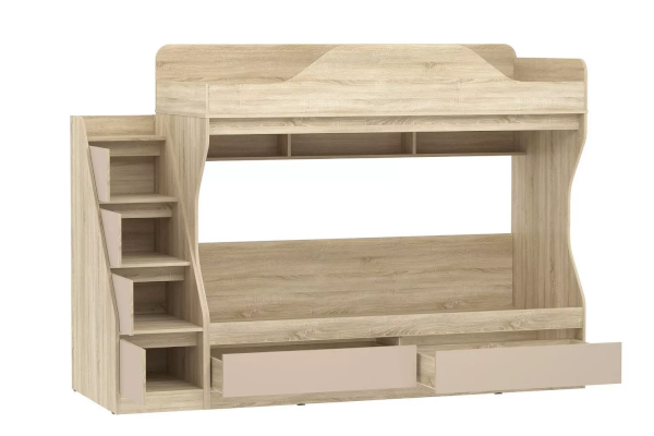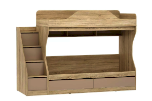 Модуль оснащен книжной полкой и вместительными бельевыми ящиками, что позволяет использовать их в качестве дополнительного места для хранения вещей. Лестница, которая входит в комплект состоящая их четырех ступеней-ящиков дает дополнительное место для хранения для игрушек и детских вещей. Ограничитель без острых углов на верхнем ярусе, обеспечит ребенку безопасный сон.