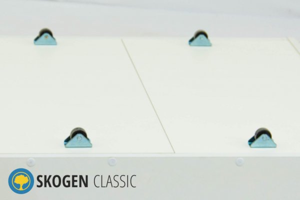 Ящик не является частью кровати, а представляет собой отдельную конструкцию. Выдвигается наш ящик не на направляющих, как встроенные, а на собственных прорезиненных колесиках высотой 30 мм. Это позволяет выдвигать его на свободное расстояние от кровати, а также выдерживать больший вес наполнения. Под кровать Svogen умещается 2 ящика.