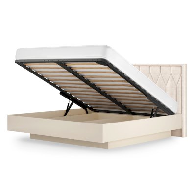 Предмет мебели выглядит особенно эффектно благодаря эффекту парения, основание кровати будто парит в воздухе и не соприкасается с поверхностью пола. Такой эффект обеспечивает конструкция бельевого короба, который утоплен под кроватью и особому основанию. Подъемный механизм оснащен газлифтом, который срабатывает, если потянуть за петлю в основании, бельевой ящик значительно сэкономит ваши средства, ведь здесь можно разместить много вещей и постельных принадлежностей, не покупая дополнительную мебель для хранения.