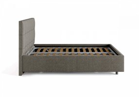 Лаконичная интерьерная кровать с изголовьем, украшенным декоративной строчкой. Модель изготовлена из ДСП. Обратная сторона изголовья обита темно-серым спандбондом, но, при желании, её можно выполнить из основного обивочного материала. В комплект кровати входит кроватное основание. Каркас основания выполнен из металла, ламели - из берёзы. При необходимости в комплект можно включить подъемный механизм с бельевым ящиком, который существенно увеличит объем хранения вещей,  а так же позволит легко производить уборку пыли под кроватью.