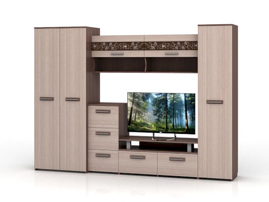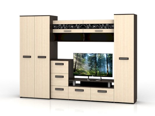 Стенка Мечта - прекрасное решение для гостиной. Сочетает в себе различные по функциональности модули, а декор из стекла добавляет контраст и оригинальность.