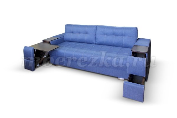 Диван со столиком значительно экономит пространство в помещении и, несомненно, делает отдых на диване комфортнее, ведь буквально под рукой есть раскладной столик в подлокотнике, на который можно поставить бокал, положить книгу или журнал, удобен при работе с ноутбуком. Другой подлокотник оборудован выдвижными полочками для хранения различных вещей. Большой ящик для белья внутри дивана, простой, и надежный механизм трансформации «тик-так» подтверждают функциональность этой модели. Блок независимых пружин, прошивка на сиденье – гарантия длительной эксплуатации дивана.