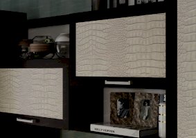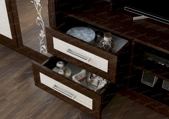 Двухцветная гостиная «Флора-2» привлекает своей простотой и универсальностью. Беспроигрышная комбинация натуральных оттенков подходит абсолютно к любому цветовому оформлению интерьера. Изящный растительный орнамент на зеркале, несимметричность конструкции, а также поверхности фасадов с фактурой под крокодиловую кожу делают комплект стильным и уникальным.