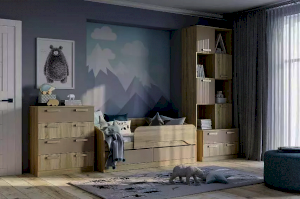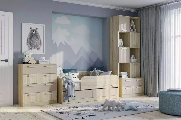 Комод «Акварель» -  прекрасный выбор для тех, кто любит практичность и комфорт. Комод обладает модным сочетанием материалов, цветов и подчеркивает настроение детства – радость новизны и жажду открытий. Четыре удобных выдвижных ящика – это огромный объем  для хранения белья, предметов одежды и аксессуаров.