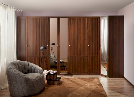 Зеркальный фасад проклеен с тыльной стороны специальной пленкой, которая задержит падение осколков в том случае, если зеркало разобьется. Аккуратная рама из МДФ по периметру фасада не делит отражение и позволяет увидеть себя в полный рост без помех.